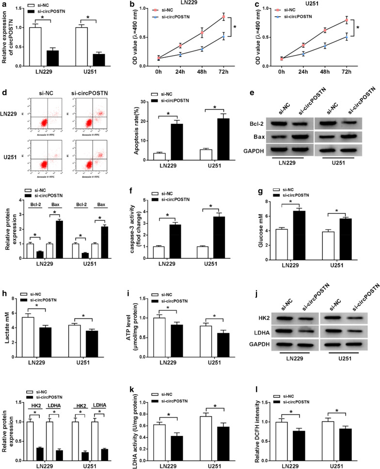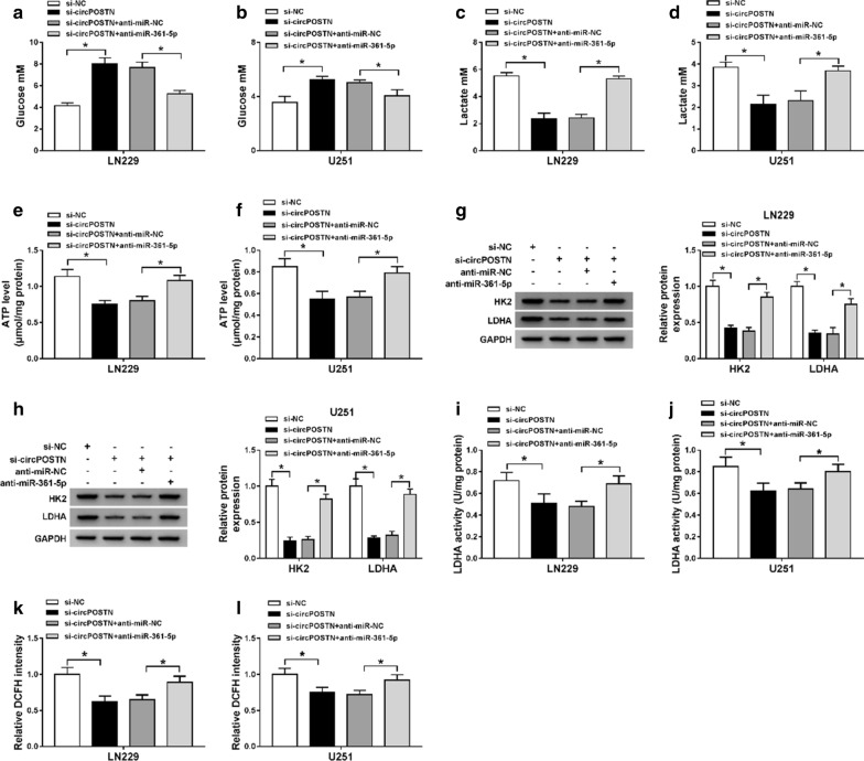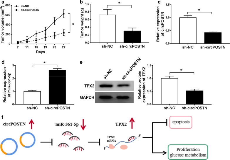 BACKGROUND: Glioma is the most primary central nervous system tumor in adults. The 5 year survival rate for glioma patients remains poor, although treatment strategies had improved in the past few decades. The cumulative studies have shown that circular RNA (circRNA) is associated with glioma process, so the purpose of this study is to clarify the function of circPOSTN in glioma. METHODS: The expression levels of circPOSTN, miR-361-5p, and targeting protein for Xenopus kinesin-like protein 2 (TPX2) were assessed with real-time quantitative polymerase chain reaction (RT-qPCR). The 3-(4, 5-dimethylthiazol-2-yl)-2, 5-diphenyl-2H-tetrazol-3-ium bromide (MTT) and flow cytometry assays were executed to examine proliferation and apoptosis of glioma cells, respectively. Western blot was applied to assess protein expression. The glucose metabolism of glioma cells was analyzed by testing the glucose consumption, lactate production, ATP level, reactive oxygen species (ROS) accumulation and performing Seahorse XF assay. The interaction relationship between miR-361-5p and circPOSTN or TPX2 was analyzed by bioinformatics database and dual-luciferase reporter assay. The influences of circPOSTN silencing in vivo were observed by a xenograft experiment. RESULTS: CircPOSTN was overexpressed in glioma tissues and cells. Absence of circPOSTN in glioma cells promoted apoptosis while impeded proliferation and aerobic glycolysis, which were mitigated by silencing miR-361-5p. What's more, loss-of-functional experiment suggested that knockdown of TPX2 repressed proliferation and aerobic glycolysis, while induced apoptosis in glioma cells. In addition, circPOSTN targetedly regulated TPX2 expression in glioma cells via sponging miR-361-5p. In vivo study revealed that deficiency of circPOSTN restrained tumor growth. CONCLUSION: Mechanistically, circPOSTN regulated cell growth, apoptosis, and aerobic glycolysis in glioma through miR-361-5p/TPX2 axis.