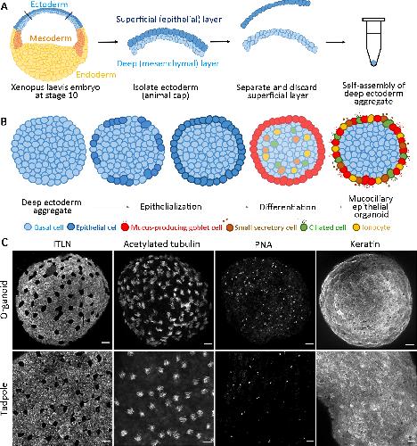 Mucociliary epithelium provides the first line of defense by removing foreign particles through the action of mucus production and cilia-mediated clearance. Many clinically relevant defects in the mucociliary epithelium are inferred as they occur deep within the body. Here, we introduce a tractable 3D model for mucociliary epithelium generated from multipotent progenitors that were microsurgically isolated from Xenopus laevis embryos. The mucociliary epithelial organoids are covered with newly generated epithelium from deep ectoderm cells and later decorated with distinct patterned multiciliated cells, secretory cells, and mucus-producing goblet cells that are indistinguishable from the native epidermis within 24 h. The full sequences of dynamic cell transitions from mesenchymal to epithelial that emerge on the apical surface of organoids can be tracked by high-resolution live imaging. These in vitro cultured, self-organizing mucociliary epithelial organoids offer distinct advantages in studying the biology of mucociliary epithelium with high-efficiency in generation, defined culture conditions, control over number and size, and direct access for live imaging during the regeneration of the differentiated epithelium.
