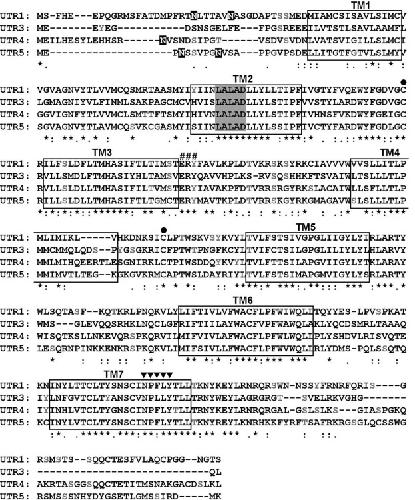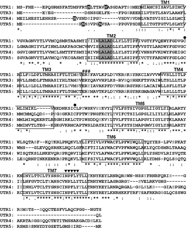 Fig. 1. Deduced amino acid sequences of urotensin II receptor (UTR) subtypes identified in Xenopus tropicalis. Deduced sequences were aligned using the ClustalW algorithm (asterisks indicate identical amino acid residues; open boxes predicted transmembrane regions; black boxes, putative N-glycosylation sites; gray characters, putative phosphorylation sites; gray boxes, LxxxD motif (where x represents any amino acid); hash, D/ERY motif; closed circles, conserved cysteine residues; and black triangles, NPxxY motif).