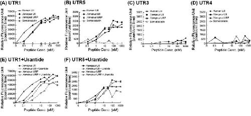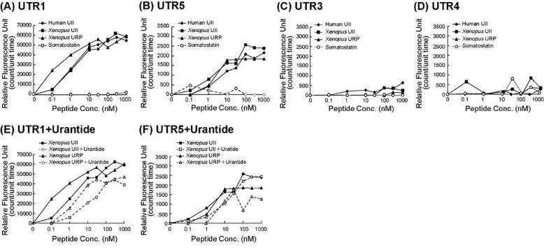 Fig. 4. Dose–response relationships of the urotensin II (UII)- or urotensin II-related peptide (URP)-mediated Ca2+ mobilization in Chinese hamster ovary (CHO) cells expressing single UTR subtypes. CHO cells transfected with single urotensin II receptor (UTR) subtypes were incubated with different concentrations (0.1–1000 nM) of human UII, Xenopus UII, URP, or somatostatin. Transfected cells were loaded with Fluo-4 Ca2+-sensitive dye and then stimulated with different concentrations of ligands. Fluorescence intensities for Ca2+ mobilization were determined using a fluorometric imaging plate reader (FLIPR) (A–D). Cells pretreated with the UTR antagonist (urantide) were stimulated with the indicated concentrations of ligands (E and F). The data are the means of duplicate wells.