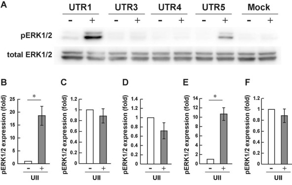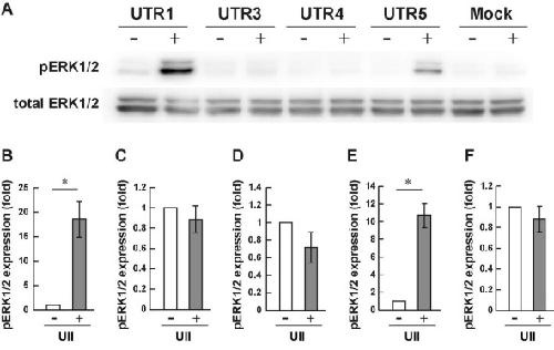 Fig. 5. Phosphorylation of extracellular signal-regulated kinase 1/2 (ERK1/2) by urotensin II (UII) stimulation in the cells expressing single urotensin II receptor (UTR) subtypes. (A) Cells transfected with single UTR subtype genes were stimulated with UII (100 nM) for 30 min. Cell extracts were western blotted using antibodies for phosphorylated and total ERK1/2 protein. The indicated blot is representative of three independent experiments. (B) The phosphorylation levels of ERK1/2 were normalized to total ERK1/2 levels. Values are expressed as fold increase vs. unstimulated cells (control) and are presented as the mean ± SEM of three independent experiments. *p < 0.05 vs. control (B and E, Welch’s test; C, D, and F, unpaired Student’s t-test).