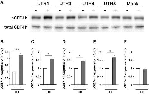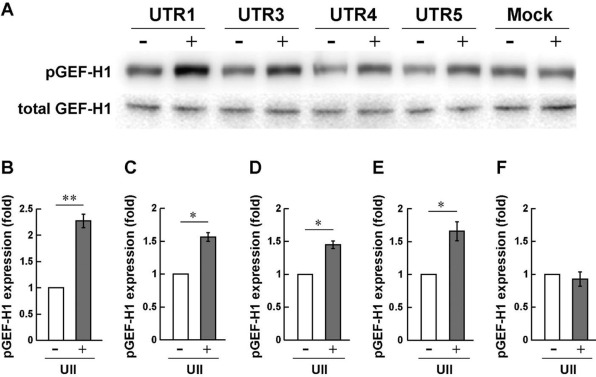 Fig. 8. Phosphorylation of guanine nucleotide exchange factor H1 (GEF-H1) by urotensin II (UII) stimulation in the cells expressing single urotensin II receptor (UTR) subtypes. (A) Cells transfected with single UTR subtypes were stimulated with UII (100 nM) for 30 min. Cell extracts were western blotted using antibodies for phosphorylated and total GEF-H1 protein. The indicated blot is representative of three independent experiments. (B) Phosphorylation levels of GEF-H1 were normalized to total GEF-H1 levels. Values are expressed as fold increase vs. unstimulated cells (control) and are presented as the mean ± SEM of three independent experiments. **p < 0.01, *p < 0.05 vs. control (Welch’s test).