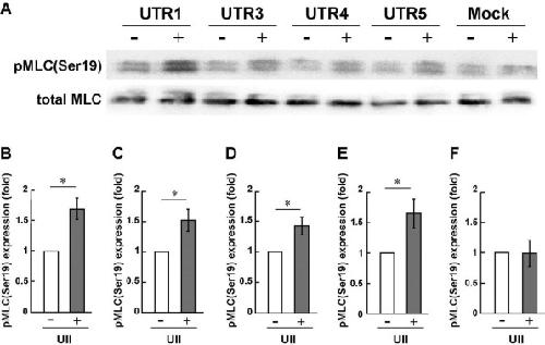Fig. 9. Phosphorylation of myosin light chain (MLC) by urotensin II (UII) stimulation in the cells expressing single urotensin II receptor (UTR) subtypes. (A) Cells transfected with single UTR subtypes were stimulated with UII (100 nM) for 30 min. Cell extracts were western blotted using antibodies for phosphorylated and total MLC protein. The indicated blot is representative of three independent experiments. (B) Phosphorylation levels of MLC were normalized to total MLC levels. Values are expressed as fold increase vs. unstimulated cells (control) and are presented as the mean ± SEM of three independent experiments. *p < 0.05 vs. control (Welch’s test).