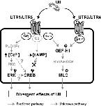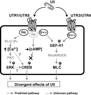 Fig. 10. Intracellular signaling pathways predicted from functional assays via urotensin II receptor (UTR) subtypes. UTR1 and UTR5 are likely to couple to Gq and G12/13 proteins and are most likely linked to PLC/PKC and GEF-H1/RhoA/ROCK/MLC signaling, similar to mammalian UTR1. cAMP response element-binding protein (CREB) phosphorylation is induced via extracellular signal-regulated kinase and other pathways, except for Gs protein-cAMP. UTR3 and UTR4 are likely linked to GEF-H1/RhoA/ROCK/MLC signaling via the G12/13 protein.