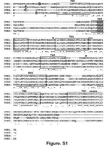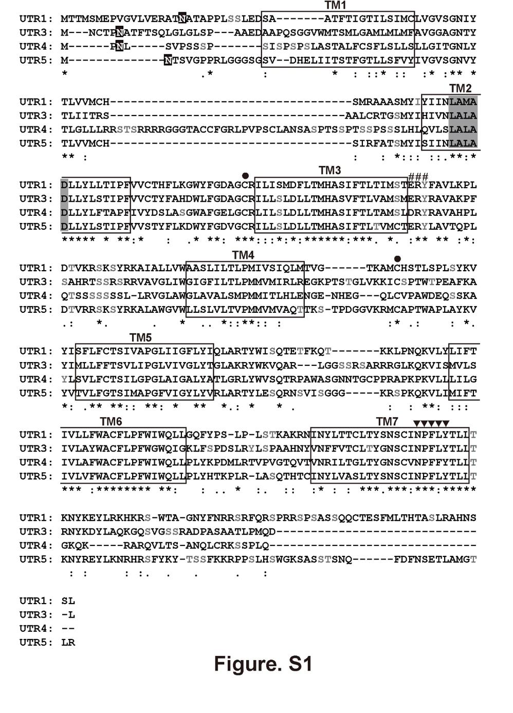 Fig. S1. Deduced amino acid sequences of urotensin II receptor (UTR) subtypes identified in Japanese medaka (Oryzias latipes). Deduced sequences were aligned using the ClustalW algorithm (asterisks indicate identical amino acid residues; open boxes, predicted transmembrane regions; black boxes, putative N-glycosylation sites; gray characters, putative phosphorylation sites; gray boxes, LxxxD motif (where x represents any amino acid); hash, D/ERY motif; closed circles, conserved cysteine residues; and black triangles, NPxxY motif).