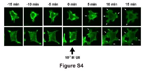 Fig. S4. Lamellipodia formation observed after urotensin II (UII) stimulation of urotensin II receptor 1 (UTR1) expressing cells. Living HEK293T cells co-transfected with Xenopus UTR1 and Lifeact-GFP (F-actin marker) were imaged in real-time using time-lapse videomicroscopy for 60 min, and individual frames were recorded before and during exposure to 100 nM UII. Lamellipodia formation (white arrow) was observed within 10 min after the addition of UII.
