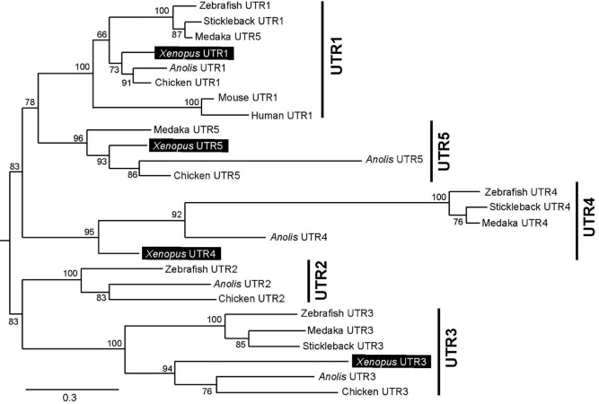 Fig. 2. Phylogenetic analysis of urotensin II receptor (UTR) subtypes in vertebrates. The phylogenetic tree was constructed by MEGA6 using the maximum-likelihood method. Data were resampled with 1000 bootstrap iterations. The accession numbers of the sequences are provided in Table S1.