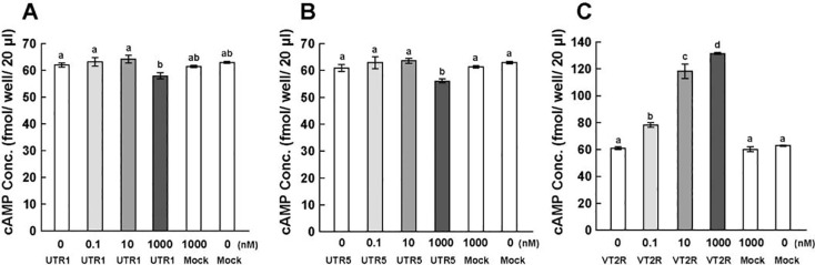 Fig. 7. Dose–response relationship of cyclic adenosine monophosphate (cAMP) production in Chinese hamster ovary (CHO) cells expressing urotensin II receptor (UTR) 1, UTR5, or vasotocin type-2 receptor (VT2R). CHO cells transfected with UTR1 (A), UTR5 (B), or VT2R (C) were incubated with different concentrations (0.1–1000 nM) of UII or vasotocin (VT) for 2 h. cAMP concentration was measured using an Alpha-screen cAMP assay kit. Data are means of triplicate wells from one representative of two independent experiments. Different letters in the plots indicate significant differences at p < 0.05 (one-way analysis of variance using Bonferroni’s multiple comparison test).