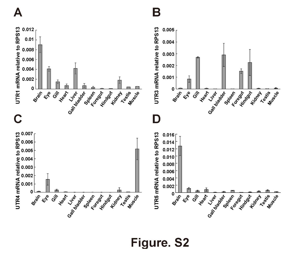 Fig. S2. Relative mRNA expression levels for urotensin II receptor (UTR) subtypes in various tissues of O. latipes. mRNA expression levels of single UTR subtypes are represented as ratios to the mRNA level of the housekeeping gene RPS13. Values are estimates for samples from three fish. A–D, relative mRNA expression level of single UTR subtypes in male and female fish.