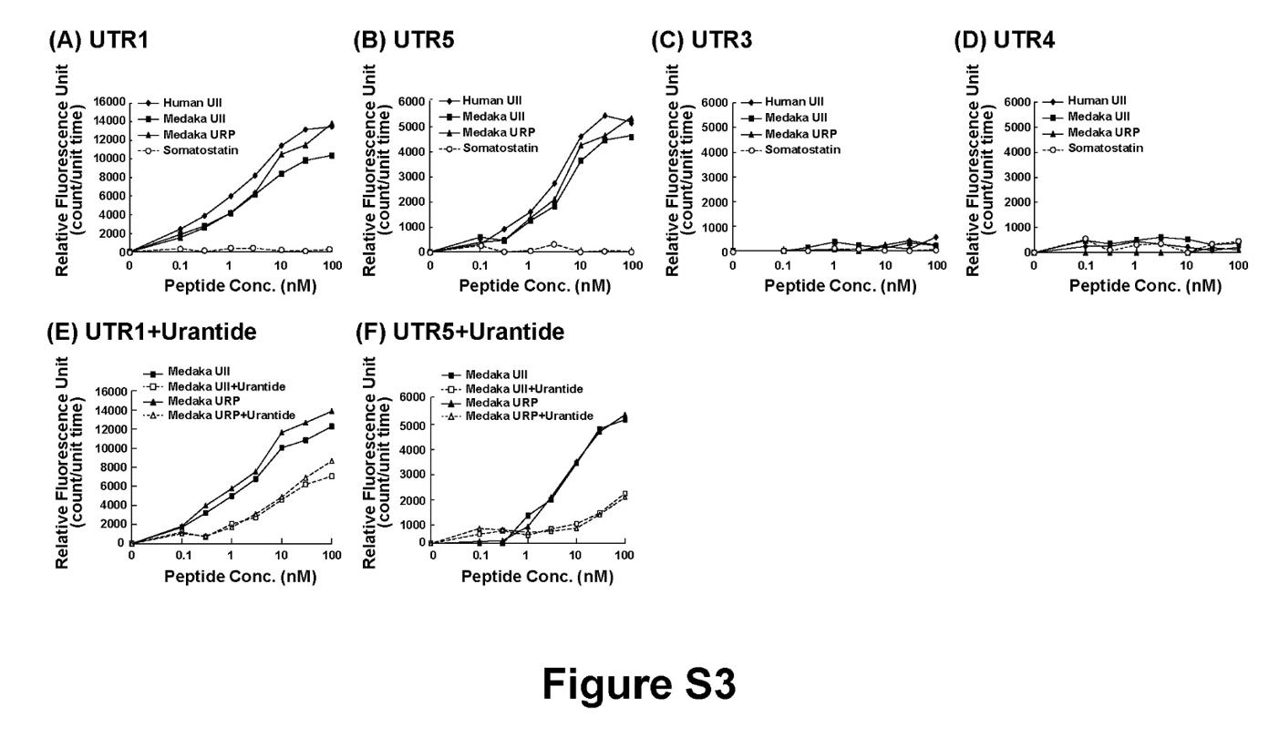 Fig. S3. Dose–response relationships of urotensin II (UII)- or urotensin II-related peptide (URP)-mediated Ca2+ mobilization in Chinese hamster ovary (CHO) cells expressing single urotensin II receptor (UTR) subtypes of Oryzias latipes. CHO cells transfected with single UTR subtypes were incubated with different doses (0.1–1000 nM) of human UII, Medaka UII, Medaka URP, or somatostatin. Transfected cells were loaded with Fluo-4 Ca2+-sensitive dye and then stimulated with different concentrations of ligands. Fluorescence intensities for Ca2+ mobilization were determined using fluorometric imaging plate reader (FLIPR) (A–D). Cells pretreated with the UTR antagonist urantide were stimulated with the indicated concentrations of ligands (E and F). The data are means of duplicate wells.