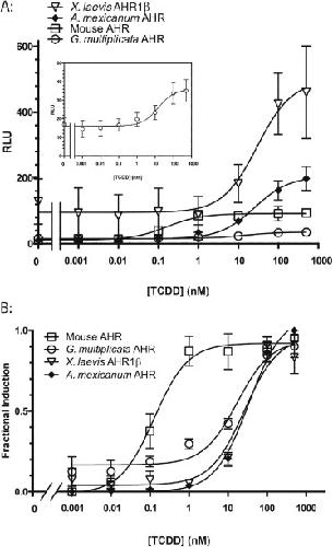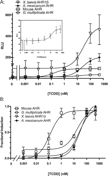 Fig. 3. TCDD-induced transactivation activity of G. multiplicata AHR. COS-7 cells were cotransfected with pGudLuc6.1 reporter construct, pRL-TK transfection control construct, and expression plasmids for X. laevis ARNT1 and each indicated AHR. Cells were treated with DMSO or TCDD for 18 h. Each plotted value represents the mean of at least three replicate assays ± standard error. (A) Transactivation activity of each AHR is given in relative luciferase units (RLU), the ratio of firefly to Renilla luciferase activity at each concentration of TCDD. Inset graph depicts G. multiplicata AHR with re-scaled y-axis. (B) Fractional induction. For each AHR, relative luciferase expression at each TCDD concentration was normalized to the maximal response, which was assigned a value of 1. Nonlinear regression was used to calculate EC50 values for each AHR. r2 values for the fitted curves are 0.81 for G. multiplicata AHR, 0.99 for A. mexicanum AHR, 0.86 for frog AHR1β, and 0.92 for the mouse AHR.