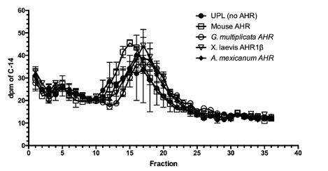 Figure S1. 14C-catalase marker fractionation. 14C-catalase standard (11.3S) was added to all sucrose density gradients in addition to the AHR proteins and 3H-TCDD. Gradients were fractionated and the radioactivity (dpm) was quantified over 15 minutes for each fraction by liquid scintillation counting. This standard served as a marker that could capture variability in protein mobility on the gradients and enable alignment of fractions from different gradients, since differences in elution position mirror the differences in 3H-TCDD peaks corresponding to specific binding of AHR. n=4 for each AHR.