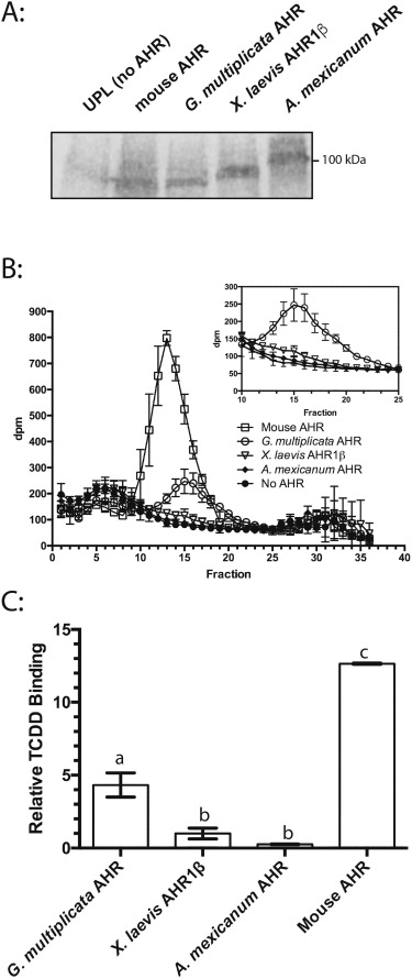 Fig. 2. TCDD binding by G. multiplicata AHR. (A) Expression of each AHR in TNT reactions determined by Western blotting. (B) Velocity sedimentation analysis of TCDD binding. Synthetic AHR proteins or unprogrammed TNT lysates were incubated with 2 nM [3H]TCDD and fractionated on sucrose density gradients. Inset graph excludes mouse AHR and contains re-scaled y-axis. (C) Quantification of TCDD-specific binding revealed by sedimentation analysis. The radioactivity (disintegrations per minute) in fractions comprising each peak in panel B was summed. Specific binding is the difference between total binding (preparations containing an AHR) and nonspecific binding (preparation lacking AHR). The bar graph plots specific binding relative to that found for X. laevis AHR1β. Values represent means ± the standard error of four replicates. Values with identical labels do not differ significantly (One-way ANOVA with Tukey’s test for individual contrasts).