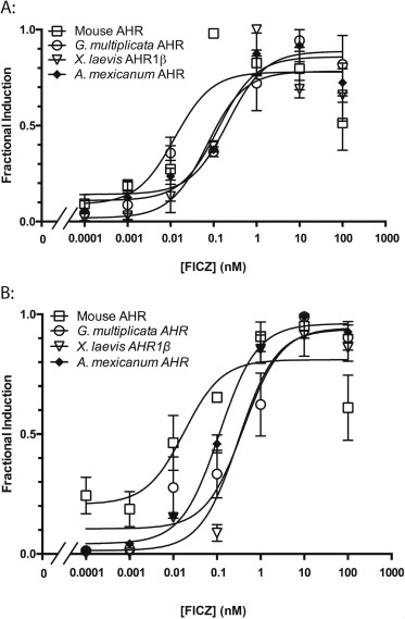 Fig. 4. FICZ-induced transactivation activity of G. multiplicata AHR. Fractional induction of reporter gene expression by each AHR following (A) 18-h or (B) 3-h exposure was determined as described for Fig. 3. Values represent mean ± standard error for at least four replicates. Panel A: r2 values for the fitted curves are 0.86 for G. multiplicata AHR, 0.91 for X. laevis AHR1β, 0.98 for A. mexicanum AHR, and 0.71 for mouse AHR. Panel B: r2 values for the fitted curves are 0.83 for G. multiplicata AHR, 0.83 for X. laevis AHR1β, 0.85 for A. mexicanum AHR, and 0.65 for mouse AHR.