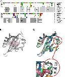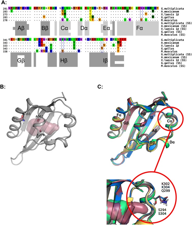 Fig. 5. Sequence and structural model for the G. multiplicata AHR. (A) Sequence alignment produced by Clustal W. Only residues that differ from the caecilian sequence are shown; dots indicate conserved positions. Variable residues that protrude into the modeled binding cavity are boxed. Color scheme for residues: red, acidic; blue, basic; purple, polar; yellow, Cys; brown, aromatic; green, hydrophobic; orange, Ser, Thr; gray, Pro; white, Gly. Secondary structures attributed by DSSPcont (SS) are indicated below: light gray bars for helices and dark gray bars for β-strands. (B) Cartoon representation of the modeled G. multiplicata AHR LBD. Residues that both differ from the high-affinity mouse or chicken AHRs and protrude into the modeled binding cavity are labeled and shown as sticks. The light red shaded area delineates the molecular surface of the binding cavity identified by CASTp. (C) Comparison of cartoon renderings for modeled LBDs of AHRs: magenta for G. multiplicata AHR, green for A. mexicanum AHR, yellow for frog AHR1β, blue for chicken AHR, and gray for mouse AHR. Black labels indicate the conserved secondary structure elements identified by DSSPcont. Magnified inset image depicts position of potentially variable residues that protrude outside the binding pockets but may nonetheless affect binding cavity dimensions (see text, Section 4.1).