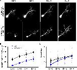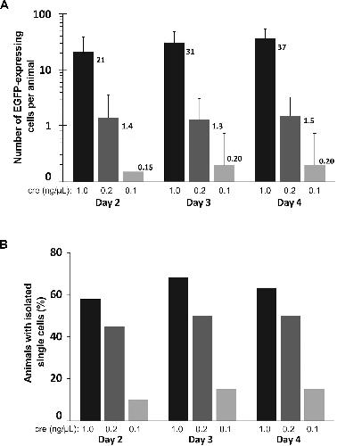 Figure 4. Quantification of labeled cells imaged over three consecutive days. Tadpoles were bilaterally electroporated with 1 μg/μL pCALNL-EGFP mixed with 1.0, 0.2, and 0.1 ng/μL pCAG-Cre plasmid (n = 19, 20, 20) and subsequently screened daily for EGFP-expressing cells from 2 to 4 days post-electroporation. (A) The number of EGFP-positive cells per animal was substantially lower with decreased levels of Cre plasmid. (B) A single isolated cell could be found in nearly half of the animals from the 1.0 and 0.2 ng/μL groups on all days of imaging, but much less frequently in the 0.1 ng/μL group. In this case the 0.2 ng/μL group had the most useful optimization, with sparse expression in a large proportion of animals (high-efficiency of single cell labeling). |