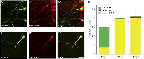 Figure 6. CREMSCLE can be used for co-expression of two proteins. (A,B) Two-photon z-projections of double labeled cells at 3 days post-electroporation. (A) pCAG-Cre (0.5 ng/μL) co-electroporated with pLNL-EGFP (1 μg/μL) and (A′) pCMV-mCherry (3 μg/μL) leads to (A′′) double labeling of sparse EGFP-expressing cells within a field of mCherry-labeled cells. Most cells labeled by EGFP are also positive for mCherry. (B) Co-electroporation of pCAG-Cre (0.1 ng/μL) with pLNL-EGFP (1 μg/μL) and (B′) pLNL-dsRed (3 μg/μL) results in nearly all cells expressing (B′′) both EGFP and dsRed by 3 days post-electroporation. (C) Number of cells per animal that expressed EGFP fluorescence (green), dsRed fluorescence (red), or both (yellow). By 2 days post-electroporation nearly every cell was double-labeled. n = 12 animals. Scale bar, 20 μm. |