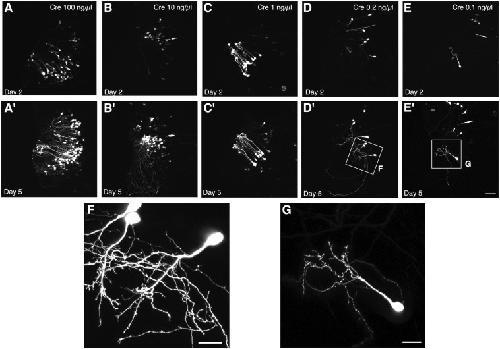 Figure 3. Titration of Cre permits single cell labeling without decreasing signal intensity. Two-photon z-projections of the transfected lobe of the tadpole optic tectum demonstrate that electroporation of 1 μg/μL pCALNL-EGFP plasmid together with increasingly dilute concentrations of pCAG-Cre plasmid results in a decreasing number of labeled tectal cells with little apparent decrease in the brightness of EGFP expression. Animals were imaged (AâE) 2 and (Aâ²âEâ²) 5 days after electroporation with 1 μg/μL pCALNL-EGFP plus pCAG-Cre concentrations of (A,Aâ²) 100 ng/μL, (B,Bâ²) 10 ng/μL, (C,Câ²) 1 ng/μL, (D,Dâ²) 0.2 ng/μL, or (E,Eâ²) 0.1 ng/μL. (F,G) Cells continue to mature and develop complex dendritic arbors over this time as can be seen in higher magnification z-series projections. Only the lowest dilution of Cre plasmid produced cells with completely non-overlapping dendritic arbors by day 5, which would be suitable for single-cell reconstruction. Scale bar, (AâE) 50 μm, (F,G) 20 μm. |