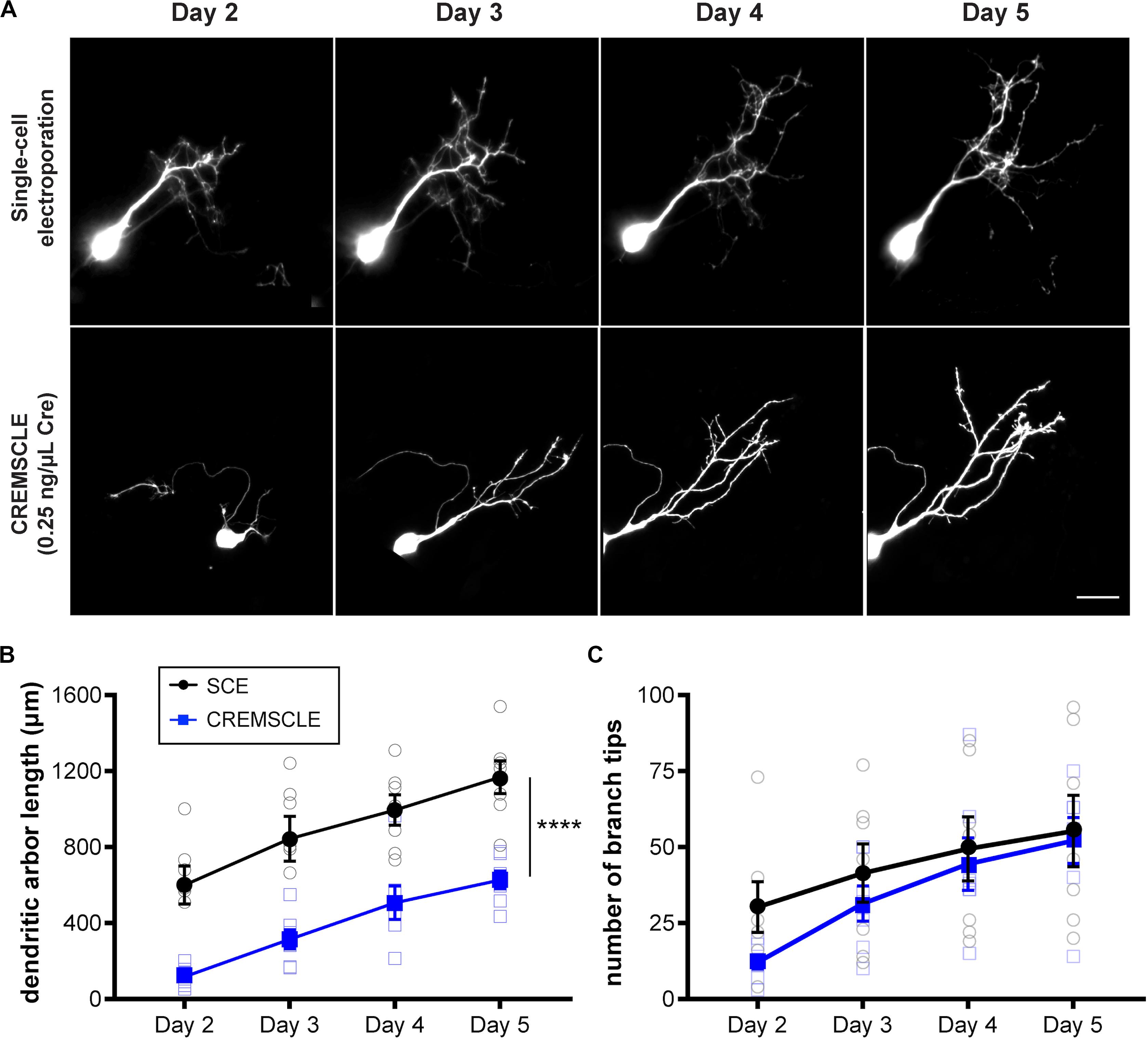 Figure 5. CREMSCLE tends to label more immature tectal neurons than SCE. Tadpoles were electroporated by SCE with pEGFP-N1 (1 μg/μL) or by CREMSCLE with pCAG-Cre (0.25 ng/μl) and pCALNL-EGFP (1 μg/μL), and subsequently imaged daily for EGFP-expressing cells from 2 to 5 days post-electroporation. (A) Two-photon z-projections of single cells following labeling by SCE or CREMSCLE. (B,C) Quantification of total dendritic arbor length (B) and number of dendritic branch tips (C) over 4 days of consecutive 2-photon imaging. Scale bar, 20 μm. ****p < 0.0001 for main effect, RM ANOVA, n = 7 cells per group. |
