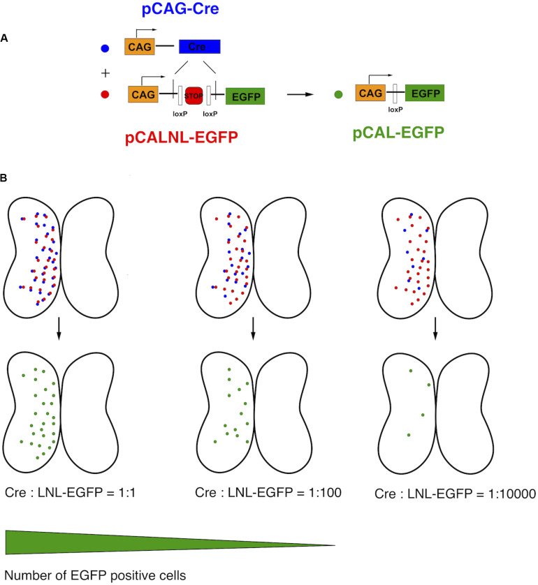 FIGURE 2. Schematic of CREMSCLE method. (A) Electroporation of large amounts of pCALNL-EGFP containing a floxed neogenin âstop cassetteâ does not lead to EGFP expression unless pCAG-Cre plasmid is co-expressed. The Cre recombinase removes the stop cassette flanked by loxP sites to allow the translation of EGFP. (B) When pCAG-Cre and pCALNL-EGFP are coexpressed in roughly equimolar ratios most cells will express EGFP. As the concentration of pCAG-Cre plasmid is reduced, keeping pCALNL-EGFP levels constant, only the very few cells that express Cre recombinase will activate pCALNL-EGFP to allow high levels of EGFP expression. |