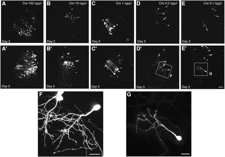 FIGURE 3. Titration of Cre permits single cell labeling without decreasing signal intensity. Two-photon z-projections of the transfected lobe of the tadpole optic tectum demonstrate that electroporation of 1 μg/μL pCALNL-EGFP plasmid together with increasingly dilute concentrations of pCAG-Cre plasmid results in a decreasing number of labeled tectal cells with little apparent decrease in the brightness of EGFP expression. Animals were imaged (AâE) 2 and (Aâ²âEâ²) 5 days after electroporation with 1 μg/μL pCALNL-EGFP plus pCAG-Cre concentrations of (A,Aâ²) 100 ng/μL, (B,Bâ²) 10 ng/μL, (C,Câ²) 1 ng/μL, (D,Dâ²) 0.2 ng/μL, or (E,Eâ²) 0.1 ng/μL. (F,G) Cells continue to mature and develop complex dendritic arbors over this time as can be seen in higher magnification z-series projections. Only the lowest dilution of Cre plasmid produced cells with completely non-overlapping dendritic arbors by day 5, which would be suitable for single-cell reconstruction. Scale bar, (AâE) 50 μm, (F,G) 20 μm. |