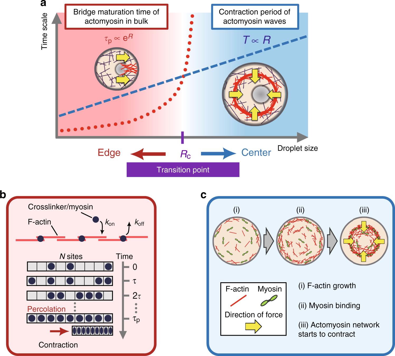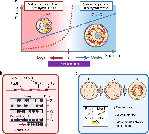 Fig. 6: Theoretical modeling of the two-state cluster positioning. a The proposed mechanism underlying droplet size-dependent two-state cluster positioning. The red dotted curve and blue dashed line represent the bridge maturation time τp and the wave period T, respectively. Actomyosin waves transport the cluster toward the droplet center every period of T, while stochastically formed actomyosin bridges (mean maturation time τp) transport the cluster towards the droplet boundary. Actomyosin bridges are stochastically formed in the time period T between actomyosin waves. If bridges are formed, the network contraction pulls the cluster toward the droplet boundary until the subsequent wave collides with the cluster. Since the characteristic time-scales of two antagonistic forces have different size dependences, the transition radius Rc is determined by one unique crossover point. The resultant stable position is determined by the matured network faster than the other. b The percolation model of actomyosin bridge formation. We describe the stochastic binding/unbinding dynamics as the percolation process, wherein crosslinking sites are occupied by crosslinkers with a probability of 1/2 in every turnover time step τ. If all sites (the total number N) are occupied by crosslinkers, an actomyosin bridge is formed between the cluster and the droplet boundary, and the cluster is transported toward the droplet boundary via actomyosin bridge contraction. The mean percolation time τp is defined as the number of time steps necessary to form the actomyosin bridge on average, and kon and koff indicate the binding and unbinding rates of crosslinkers, respectively. c An active gel model of periodic actomyosin wave formation. The wave period is determined by the sum of three sequential processes: (i) actin network formation by F-actin growth, (ii) stress generation by myosin binding, and (iii) the ring starts to contract toward droplet center. |