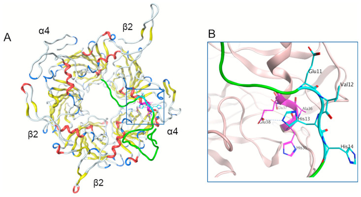 Figure 1. Model of the interaction of the α4β2 nAChR site 35HAEE38 with Aβ42 after 100 ns of molecular dynamics structure equilibration. (A) Model of the α4β2 structure with bound Aβ42 peptide, viewed from the extracellular side. (B) Detailed view of the interaction interface. The Aβ42 peptide is colored green with the 11EVHH14 site shown in cyan. The 35HAEE38 site is colored magenta. The N-terminal α-helix of both α4 and β2 subunits is colored red. |