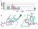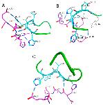 Figure 2. Global docking of Ac-HAEE-NH2 to Aβ42. (A) A histogram of Aβ42 atomic contacts to the Ac-HAEE-NH2 tetrapeptide for the data from six docking servers. The position of the 11EVHH14 site is highlighted in red. Calculated by QASDOM [20] metaserver. (B,C) Examples of the docked Ac-HAEE-NH2 peptide. The Aβ42 peptide is colored green, with the 11EVHH14 site shown in cyan, and the Ac-HAEE-NH2 tetrapeptide is colored magenta. |
