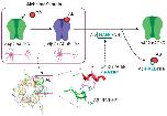 Figure 6. The possible role of 11EVHH14:35HAEE38 interface in cholinergic deficit associated with Alzheimerâs disease. In brains of Alzheimerâs disease patients, interaction of Aβ with nAChRs causes transition of the receptor from functional state (green) to dysfunctional state (violet), which may lead to selective loss of cholinergic neurons (top left). Our results suggest that the interaction of Aβ with α4β2 nAChR is mediated by charge complementary interface 11EVHH14:35HAEE38 (bottom left and middle) and that Ac-HAEE-NH2 peptide corresponding to this interface can competitively displace Aβ from the complex and restore the functionality of α4β2 nAChR (top right). |