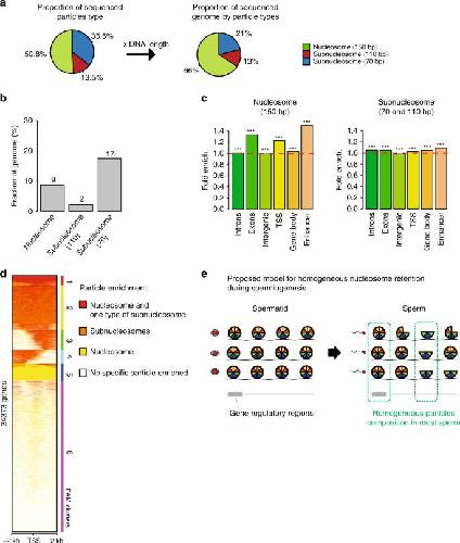 Fig. 2: Nucleosome loss/retention associated with spermiogenesis occurs non-randomly in a large fraction of the genome. a Relative abundance (left) and genome coverage (right) of nucleosomes and subnucleosomes in the sperm chromatin. The left pie chart reports the fraction of DNA fragments from Xenopus Laevis sperm corresponding to each type of particle; the right pie chart reports the fraction of genome covered by each type of particle. b Fraction of the genome with homogeneous particles composition. The bar graph indicates the percentage of the genome that possess nucleosomal or subnucleosomal structure across most sperm of the population sequenced (genome binned in 50 bp windows). c Fold enrichment (observed/random) over 1000 randomisations for homogeneous nucleosomes (left) or subnucleosomes (right) composition at the indicated genomic features; ***: empirical p value < 1eâ3. Input data from two independent replicates were pooled. d PAM (partitioning around medoids) clustering of promoter (TSS +/â2âkb) according to enrichment for nucleosomes or subnucleosomes. e Model of nucleosomes and subnucleosomes distribution in sperm and spermatid. Source data related to a, b and d are provided as Source Data files. |