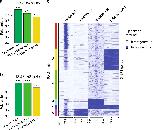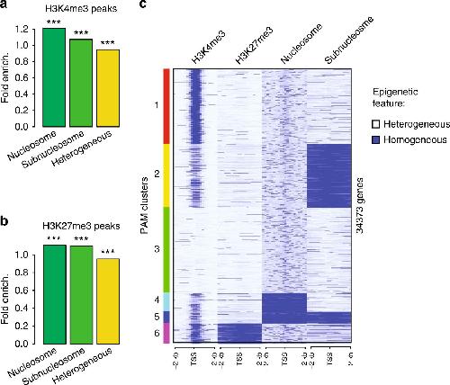 Fig. 4: Homogeneous bivalent marking of histone H3 on sperm developmental genes. a Fold enrichment (observed/random) over 1000 randomisations of peaks with homogeneous H3K4 methylation (HMDâ>â80) in regions homogeneous for nucleosomes, homogeneous for subnucleosomes or with heterogeneous particle composition in a sperm population; ***: empirical p valueâ<â1eâ3. b Same as in a for H3K27 methylation. c PAM clustering of promoter (TSS +/â2âkb) according to homogeneity for methylation of histone H3 (HMDâ>â80) on Lysine 4, on Lysine 27, enrichment for nucleosomes and enrichment for subnucleosomes. Source data related to c is provided as a Source Data file. ICe-ChIP data from two independent replicates were pooled. |