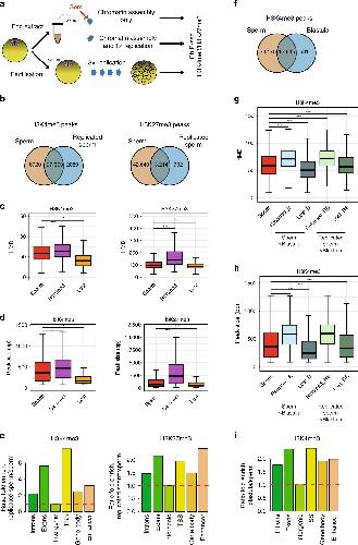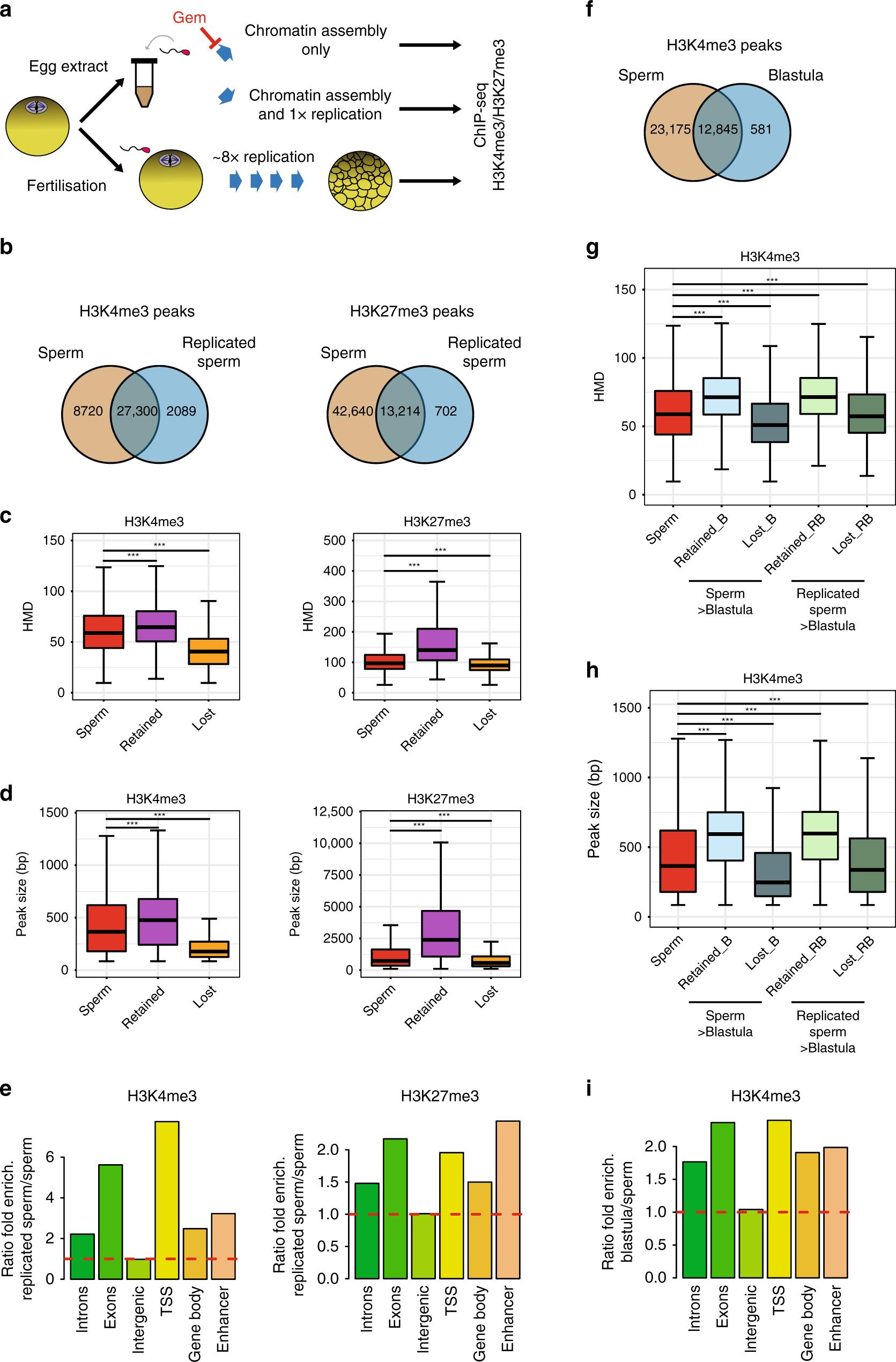 Fig. 5: Homogeneously methylated sperm histones are maintained during early embryonic replication. a Experimental setup to monitor the fate of sperm-methylated histone peaks after replication. b Overlap between peaks of H3K4me3 and H3K27me3 before and after replication of sperm chromatin in egg extract. c Boxplots of HMD for all sperm peaks and for peaks that are lost or retained after replication. d Boxplots of the size of all sperm peaks, and of peaks that are lost or retained after replication. Data in c and d are obtained from N. sperm peaks H3K4me3: 36020; N. sperm retained H3K4me3: 27300; N sperm lost H3K4me3: 8715. N. sperm peaks H3K27me3: 55854; N. sperm retained H3K27me3: 13214; N sperm lost H3K27me3: 42635. ***p valueâ<â1eâ3 (two-sample KolmogorovâSmirnov test). e Ratio of fold enrichment of peaks retained after replication over those lost after replication at indicated genomic features. Fold enrichments (observed/random) were obtained from 1000 randomisations and all instances showed an empirical p valueâ<â1eâ3. f Overlap between peaks of H3K4me3 in sperm and in blastula embryos. g Boxplots indicating HMD for all sperm peaks and for peaks that are lost or retained in blastula compared with sperm, and lost or retained in blastula compared with replicated sperm. h Boxplots of peak sizes for all sperm peaks and for peaks lost and retained in blastula compared with sperm, and in blastula compared with replicated sperm. In g and h ***p valueâ<â1eâ3 and are obtained by the two-sample KolmogorovâSmirnov test. i Ratio of fold enrichment of peaks retained in blastula versus those in sperm at indicated genomic features. This ratio has been obtained as in e. HMD is from data pooled from two independent replicates. Peaks retention/lost are consensus from three independent replicates. |