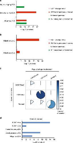 Fig. 6: The homogeneously methylated histone fraction in frog sperm chromatin regulates embryonic gene expression. a Barplot of enrichment p values (âlog10) in set of genes expressed at zygotic gene activation (all-, developmental- and house keeping-ZGA genes) for the presence of different type of H3K4me3 or H3K27me3 sperm peaks. pink and light green barsâ=âenrichment p value for heterogenous (HMDâ<â80) peaks in promoter; red and green barsâ=âenrichment p value for homogeneous (HMDâ>â80) peaks in promoter that are also retained after replication. P values determined by the Ï2 proportion test evaluating if the proportion of gene of interest is higher (alternativeâ=ââgreaterâ) than the genome-wide proportion (i.e., expected proportion). b Barplot of enrichment p values (âlog10) in set of genes whose embryonic expression is sensitive to the presence of histone H3K4 demethylase (Kdm5b) or histone H3K27 demethylase (Kdm6b) at fertilisation2 for the presence of the aforementioned sperm peaks categories. P values are obtained as in a. c Pie chart indicating the percentage of the homogeneously methylated histone present in sperm that are retained after egg extract-mediated replication. Three type of sperm peaks are considered: homogeneous for H3K27me3 only, homogeneous for H3K4me3 only and homogeneous for H3K27me3 and H3K4me3 (bivalent). The area of the coloured sector (together with the colour) indicates the fraction of the overlap between each pair-wise comparison. d Barplot of enrichment p values (âlog10) in various set of genes for the presence of a homogeneous bivalent H3K4me3 and H3K27me3 retained after replication. P values are obtained as in a. HMD are from data pooled from two independent replicates. Peaks retention/lost are consensus from three independent replicates. Set of kdm5 and kdm6 sensistivite genes are from three independent replicates. |