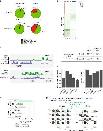 Fig. 7: Homogeneous retention of methylated nucleosome in a human sperm population. a Percentage of the genome (left) and percentage of peaks (right) with different levels of H3K4 or H3K27 methylation density in human sperm. b PAM clustering of H3K4 and H3K27 HMD levels at promoter regions (TSS +/â2âkb) in human sperm. c Genome browser screenshots of TBX3 and BMI1 HMDs in human sperm. d Percentage of gene orthologues with peaks of histone methylation in both human and Xenopus sperm. e Barplots of the average percentage (%) of 5mC methylation at H3K27me3 peaks stratified by methylation level (left); error bars: sem; barplot of the percentage of H3K27me3 peaks showing absence of 5mC methylation (right) (5mC methylation: single-sperm bisulfite sequencing data from ref. 31). f Barplots indicating âlog10 (p value) for enrichment of sperm TSSs with HMDâ>â80 for H3K4 or H3K27 in set of genes with TSSs showing different chromatin accessibility level in eight cell embryos (open and closed corresponds to TSSs open or closed in all cells of a eight cell embryos), whereas divergent corresponds to TSSs either open or closed in different cells (ATAC-seq data from ref. 31); p values determined by Ï2 proportion test evaluating if the proportion of gene of interest is higher (green) or lower (red) than the genome-wide proportion (i.e., expected proportion). g Model of epigenetic homogeneity in Xenopus and human sperm. The cartoon summarises the observed trends in retention of modified histones across the genome in those species. Source data related to b and e are provided as Source Data files. |