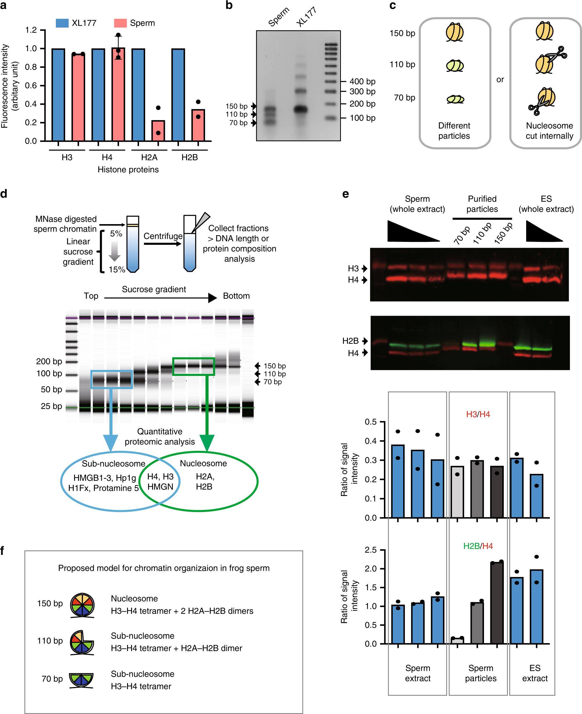 Fig. 1: Somatic level of histone H3/H4 is retained as nuclesosomes and subnucleosomes in sperm chromatin. a Xenopus laevis sperm core histones content relative to that found in a somatic cell (XL-177) as measured by quantitative WB (H2A, H2B, H3 nâ=â2, H4 nâ=â3, biologically independent samples error bar on H4 shows standard deviation). b DNA fragments generated by MNase digestion of Xenopus laevis sperm and somatic cell. c Schematic representation of the possible origin of subnucleosomal sized fragments generated by MNase treatment of sperm chromatin. d Nucleoproteic particles generated by MNase treatment of sperm are centrifugated on a sucrose gradient. Subsequently, particles isolated along the gradient are analysed for associated DNA fragment length (electrophoresis) and for associated proteins (mass spectrometry). e WB analysis confirms mass spectrometry analysis. Similar ratio of H3 to H4, and decreased level H2B to H4 are detected in subnucleosomes compared with nucleosomes. Xenopus sperm and mESCs are shown as control. Graphs below show the quantification of WB data (nâ=â2, biologically independent samples). f Model of core histone composition of Xenopus laevis sperm nucleosomal and subnucleosomal particle. Source data related to a, b, d and e are provided as Source Data files. |