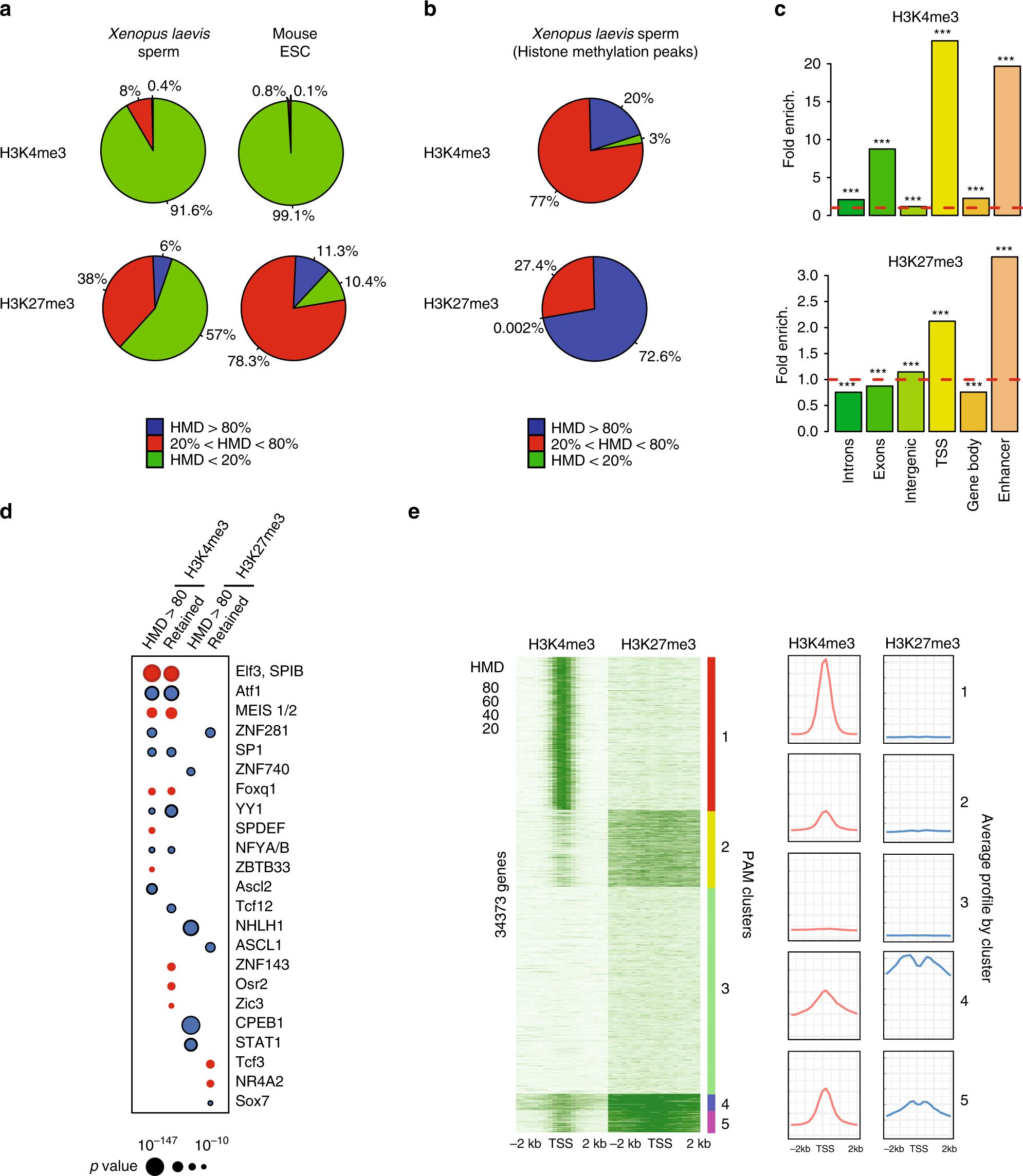 Fig. 3: A fraction of the genome harbours methylated H3K4 and/or H3K27 at the same location in most sperm of a population. a Percentage of the genome with different range of apparent histone H3 methylation density (HMD) on Lysine 4 and 27 in Xenopus Laevis sperm and mouse ESC. b Percentage of H3K4me3 and H3K27me3 peaks with different range of HMD in Xenopus Laevis sperm. c Fold enrichment (observed/random) over 1000 randomisations of peaks with homogeneous histone methylation (HMDâ>â80) at the indicated genomic features; ***: empirical p valueâ<â1eâ3. ICe-ChIP data from two independent replicates were pooled. d Dot matrix showing transcription factors with enriched motifs (y-axis) in the different histone methylation categories (x-axis). Circle size represents âlog10 (p value) of the motif enrichment; and the circle colour indicates whether evidences exist indicating that the corresponding transcription factors is present maternally (blue) or not (red). Retained HMDâ>â80 peaks correspond to sperm histone methylation peaks maintained after extract treatment as in Fig. 5. e Heat map after PAM clustering of promoters (TSS +/â2âkb) according to histone H3-methylation density on Lysine 4 and 27. The plots on the left show the average HMD profile for each cluster. Source data related to a, b, d, and e are provided as Source Data files. |
