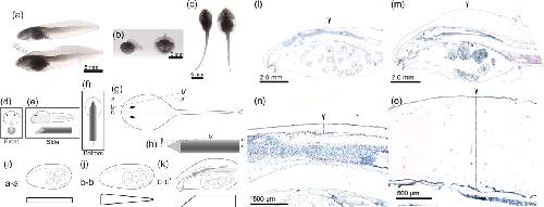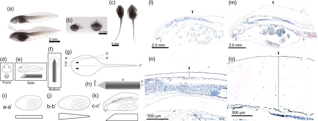 (aâc) Tadpoles are shown in side view (a), front view (b) and top view (c); the control tadpole is the upper specimen in (a) and the left specimen in (b) and (c), the bulgy morph tadpole is the lower specimen in (a) and the right specimen in (b) and (c). (dâk) Schematic diagrams illustrating the center marker method for ensuring preparation of midline sections. The tadpole is positioned over the midline of the center marker (d,e,f). (i) illustrates a section cut along the line a-aâ² of the tadpole (g) and of the center marker (h). (j) illustrates an oblique section along the line b-bâ² of the tadpole (g) and of the center marker (in h). (k) illustrates a midline section along the line eâf of the tadpole (g) and of the center marker (h). (lâo) Hematoxylin-eosin stained sections of control and bulgy morph tadpoles. Images of the head end of control (l) and bulgy morph (m) tadpoles, and their parietal regions (n, o, respectively).