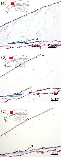 (a) Section stained at pH2.5, (b) section stained at pH1.0, (c) section stained at pH2.5 after hyaluronidase treatment. Ct, cartilage.