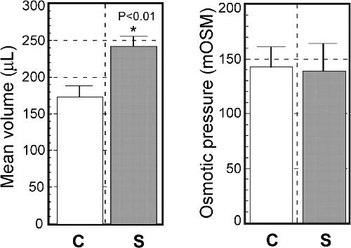 Tadpoles were homogenized using a Polytron (Kinematica) and the homogenate centrifuged at 15,000â rpm for 30â min at 4°C. The total volume of supernatant from each tadpole was measured using a micropipette (nâ=â24 control (C); nâ=â25 bulgy morph (S) stimulated by predator); osmolarity was measured using the supernatant (nâ=â14 control; nâ=â15 bulgy morph). Vertical bars represent standard errors, and * indicates a significant difference by Student's t test (p<0.01).