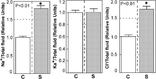 Tadpoles were homogenized using a Polytron (Kinematica) and the homogenate was centrifuged at 15,000 rpm for 30 min at 4°C. Na, K, Cl ion concentrations were measured in the supernatants of control (C) and bulgy morph (S) tadpoles (C, n = 16; S, n = 21); the data are expressed as values relative to control levels. Vertical bars represent standard errors, and * indicates a significant difference by Student's t test (p<0.01).