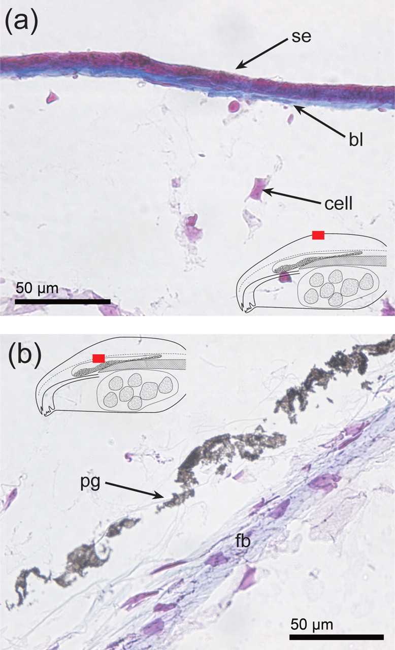 The relative position of each image on the section is identified by the region highlighted in red in the superimposed line drawing. (a,b) Mallory-Azan staining of the parietal region. In (a), a typical region of the parietal surface is shown, while (b) shows the structure of a deeper part of the parietal region. bl, basal lamella; fb, fibroblast; cell, connective tissue cell; pg, pigment granule; se, squamous epithelium.