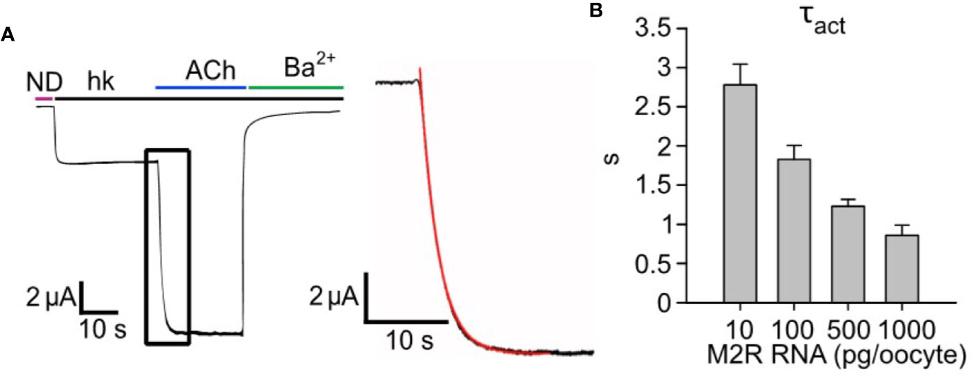 Figure 1. Increasing expression levels of M2R accelerates the activation of GIRK1/2. (A) â a representative GIRK1/2 activation experiment. Oocytes were injected with the following RNAs: GIRK1 and GIRK2 (2 ng/oocyte each) and 500 pg/oocyte M2R. Ievoked was elicited by 10 µM ACh. Inset- zoom-in on the activation phase of Ievoked (black plot) and a mono-exponential fit (red). (B) â kinetics of GIRK1/2 activation. Oocytes expressed a constant amount of GIRK1/2 (2 ng RNA/oocyte), with increasing levels of M2R, in the range 10-1000 pg/oocyte, and Ïact was determined by monoexponential fitting as shown in A (N=2-7 experiments, n= 13-25 cells). |