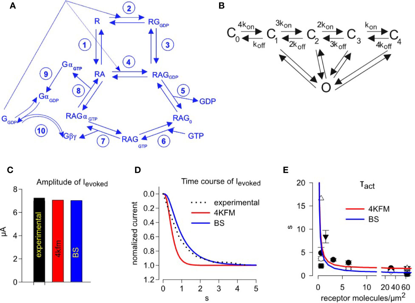 Figure 4 Simulating activation kinetics and its dependence on M2R surface density. (A) â scheme of the G-protein cycle. (B) â graded contribution model of GIRK1/2 activation. Rate constants of reactions shown in A and B are summarized in Table 1. (C) âcomparison of the experimentally observed and predicted ACh-evoked currents, with GIRK-Gβγ interaction parameters from two structural models, 4KFM and BS. (D) - representative analysis of the time course of GIRK1/2 activation. The experimental result (dotted black line) is from an oocyte injected with 0.5 ng M2R RNA. Superimposed are simulated currents according to graded contribution model of GIRK1/2 activation. The experimental parameters in this cell were: Ibasal = 15.5 µA, Itotal= 22.8 µA. Estimated channel density was 36 channels/µm2. Initial concentrations of Gα and Gβγ available to the channel are: for the case of 4KFM model 3.23 molecules Gαi/channel and 0.45 molecules Gβγ/channel; for the case of BS model, 3.24 molecules Gαi/channel and 0.46 molecules Gβγ/channel. Each plot represents the recorded or simulated current normalized to its maximum. (E) â mean Ïact values from all experiments with wild-type M2R, superimposed on data obtained from fitting of simulated time-courses according to different models. Each experimental point shows mean value of Ïact ± SEM from one experiment (n=3-7 oocytes). Simulated time courses were generated for the case described by Yakubovich et al. as âhigh density groupâ, i.e. Ibasal =13.36 µA, Itotal =17.2 µA, n=21 channels/µm2. Amounts of available Gα and Gβγ molecules per one channel, that are required to obtain the observed Ievoked, were calculated using the graded contribution model: with the BS structure-based parameters, 3.65 Gβγ and 0.39 Gα molecules/channel; with the for 4kfm structure-based parameters, 3.62 Gβγ and 0.38 Gα molecules/channel. |