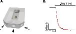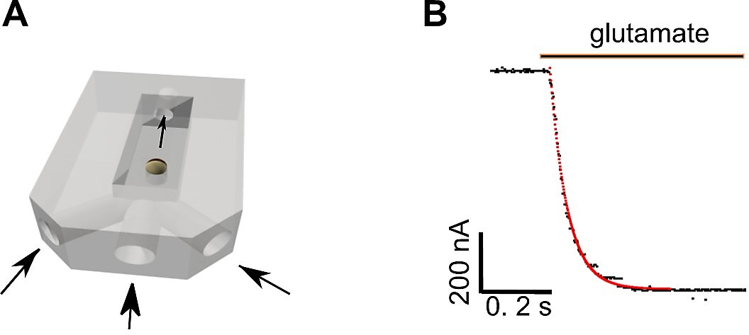 Supplemental Figure S1 | Kinetic measurements of time course of AMPA-R activation. (A) –configuration of the experimental chamber used for fast perfusion experiments. (B)– a representative record (black dots) of current evoked by 1 mM glutamate. The red dots represent mono-exponential fit of the activation time course of the current (τact=49.5 s). |