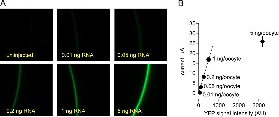 Supplemental Figure S2 | Linear relationship between Gβγ-activated YFP-GIRK1/GIRK2 current and total surface density is observed in the range 0-1 ng of YFP-GIRK1 RNA. (A) â representative confocal images of oocytes expressing YFP-GIRK1/GIRK2. Channels were expressed by injecting the indicated doses of RNA of YFP-GIRK1 and GIRK2 (1:1) and activated by coexpression of 5 ng Gβ and 1 ng Gγ RNA. (B) â correlation between total GIRK surface density and the Gβγ-dependent GIRK current, Iβγ. Iβγ is the total agonist-independent current in Gβγ-expressing oocytes. It was measured in 24 mM K+ solution by subtracting the non-GIRK currents remaining after inhibition of >95% GIRK activity by 5 mM Ba2+ (Rubinstein et al., 2007). Total surface density is reflected in YFP fluorescence levels, functional channel density is proportional to Iβγ. Correlation between Iβγ and fluorescence is linear for RNA doses of YFP-GIRK1/GIRK2 up to 1 ng/oocyte of each subunit. n = 6-12 for each point. |