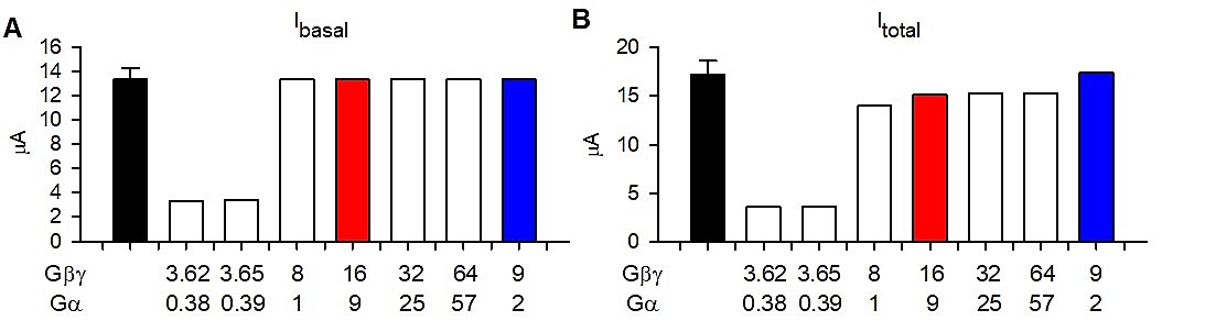 Supplemental Figure S3 | Estimation of Gβγ and Gα densities for simulation with cooperative gating model. (A) – Ibasal currents rendered by different pairs of Gβγ and Gα densities selected for simulation. (B) – Itotal currents rendered by different pairs of Gβγ and Gα densities selected for simulation.Red bars indicate Gβγ and Gα densities used for calculations in Figures 6A, B. Blue bars indicate Gβγ and Gα densities used for calculations in Figures 6C, D. All calculations except the 9:2 Gβγ/Gα pair (blue bar) have been made for the condition of fast hydrolysis of GTP, khydrolysis=2 s-1. The 16:9 Gβγ/Gα pair was the lowest dose of G protein subunits per channel that reproduced Itotal under this condition. Lower doses of Gβγ/Gα produced lower Itotal. The 9:2 Gβγ/Gα pair was the lowest G protein subunits combination that reproduced Itotal under the condition of low GTP hydrolysis rate (khydrolysis=0.02 s-1). |