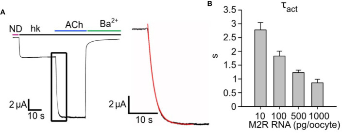 Figure 1 Increasing expression levels of M2R accelerates the activation of GIRK1/2. (A) â a representative GIRK1/2 activation experiment. Oocytes were injected with the following RNAs: GIRK1 and GIRK2 (2 ng/oocyte each) and 500 pg/oocyte M2R. Ievoked was elicited by 10 µM ACh. Inset- zoom-in on the activation phase of Ievoked (black plot) and a mono-exponential fit (red). (B) â kinetics of GIRK1/2 activation. Oocytes expressed a constant amount of GIRK1/2 (2 ng RNA/oocyte), with increasing levels of M2R, in the range 10-1000 pg/oocyte, and Ïact was determined by monoexponential fitting as shown in A (N=2-7 experiments, n= 13-25 cells). |