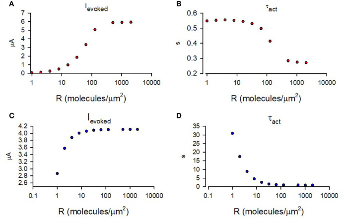 Figure 6. Simulation of GIRK1/2 activation according to cooperative gating model. (A) – Simulated values of Ievoked obtained for a range of M2R densities. (B) – τact of mono-exponential fit of simulated Ievoked obtained for a range of M2R densities. For A and B, the rate constants were taken from Touhara et al. (1) and it was assumed that Gβγ =16 molecules/channel and Gα = 9 molecules/channel (red circles). (C) – Simulated Ievoked obtained from simulation with khydrolysis = 0.02 s-1 and a range of M2R densities. (D) - τact of mono-exponential fit of time-course from simulation of Ievoked with khydrolysis = 0.02 s-1 and a range of M2R densities. For calculations done in (C, D), khydrolysis was assumed to be 0.02 s-1 and Gβγ = 9 molecules/channel and Gα = 2 molecules/channel (blue circles). |
