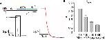 Figure 2 Estimating the surface density of M2R-YFP. All data are from one experiment. (A) - (left) Representative micrographs of oocytes (membrane at equator) expressing equal amounts of RNAs of YFP-GIRK1 and GIRK2, and 1 ng M2R (wt). Injected YFP-GIRK1 mRNA amounts are indicated. (right) Representative currents from oocytes from the same experiment (from the same groups as in left panels). Note the gradual increase in Ibasal and Itotal, reaching a plateau at 2 ng/oocyte of channelâs RNA. The current measurements in this experiment were done with a slower perfusion rate and were not included in the kinetic analysis. (B) â Representative micrographs of oocytes, injected with the indicated amounts of M2R-YFP, imaged at the same day and under identical settings as those in A. (C) â Itotal of YFP-GIRK1/GIRK2 channels as a function of channelâs RNA dose. (D) â calibration of the surface density of YFP. YFP-GIRK1 fluorescence (in arbitrary units, AU) is plotted versus channel density induced by the two lowest doses of GIRK RNA (<1 ng/oocyte), within the linear range of fluorescence-current relationship. Channel density was calculated from Itotal as explained in the text. The correlation between fluorescence and number of YFP-GIRK1 molecules is shown with superimposed linear regression line, extended to origin of coordinates. The regression equation was y=4x, i.e. one channel/µm2 corresponds to fluorescence intensity of 4 AU. Note that, since each channel has two YFP molecules, the calibration factor in this experiment is: 1 YFP molecule/µm2 = 2 AU. (E) âestimating the surface density of M2R-YFP, for RNA concentrations of 1, 2 and 5 ng/oocyte. YFP fluorescence, in AU, is shown on the left Y-axis. M2R-YFP surface density (right axis) was calculated using the calibration factor derived from YFP-GIRK1/GIRK2 measurements. The relationship between M2R-YFP RNA dose and M2R-YFP surface density was fitted with linear regression, extended to the origin of coordinates, in the form y=62.5x. |