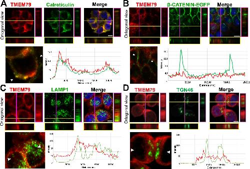 Figure 4. TMEM79 is likely an ER-resident protein. (A to D) Immunofluorescence microscopy of endogenous TMEM79 (red) with ER, PM, lysosome, and Golgi markers (green), respectively, with the nucleus labeled by DAPI (blue). The z-axis is shown on right and underneath. The white scale bar represents 10 µm. Fluorescence intensity of TMEM79 and the respective marker is measured between the two arrowheads in the lower left panel and plotted at lower right. (A) TMEM79 is localized at the ER. TMEM79 and calreticulin (an ER marker) overlap extensively in images and intensity traces. (B) TMEM79 is not present at the PM, which is visualized by β-catenin-EGFP (produced from the endogenous β-catenin gene with an in-frame knock-in of the EGFP gene, see Materials and methods). Note that β-catenin is predominantly localized at the PM in epithelial cells. (C) Some TMEM79 is observed at the lysosome. TMEM79 and LAMP1 (lysosomal-associated membrane protein 1) overlap occasionally. (D) TMEM79 is hardly observed at the Trans Golgi and exhibits little or minor overlap with TGN46 (trans-Golgi marker 46). |